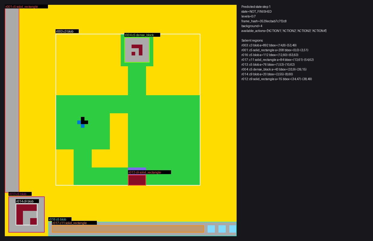 The repo also builds structured board summaries using connected components, dominant colors, changed regions, and transition diffs so agents can reason about richer descriptions than raw grids alone.