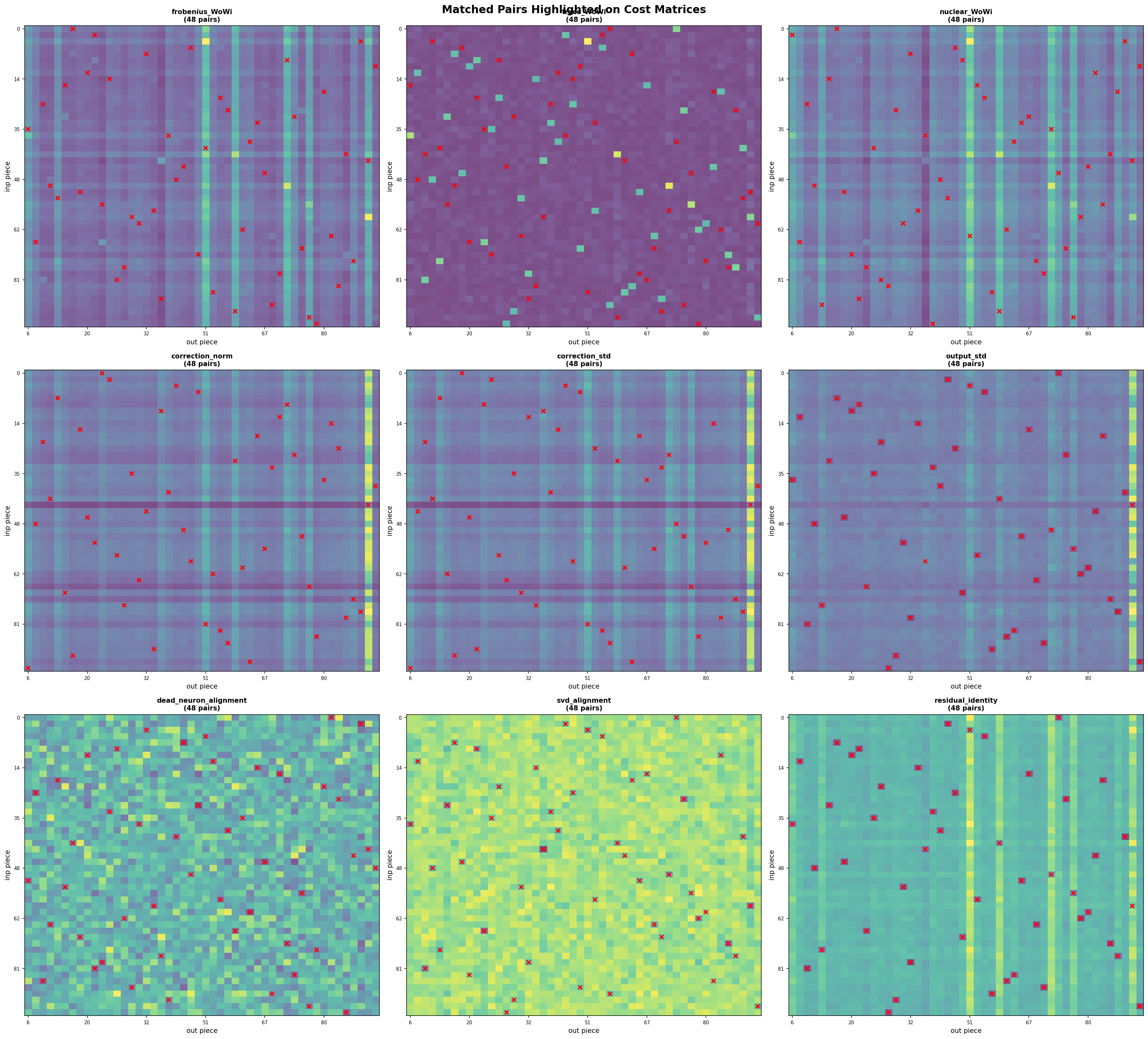 The pairing stage combined several signals instead of relying on only one metric. I used norms, trace-like statistics, activation behavior, dead-neuron alignment, and residual-structure heuristics, then solved the final one-to-one assignment with the Hungarian algorithm.